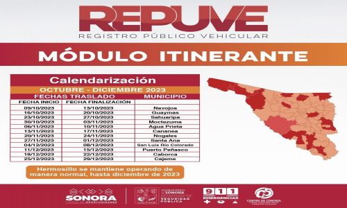 Hermosillo, Sonora; 11 de julio de 2022.- Se mantendrán operando con normalidad los siete módulos del Registro Público Vehicular (Repuve) de Sonora durante el próximo período vacacional de verano, informó Diana Acosta Encinas, directora general del Centro de Atención a Llamadas de Emergencia (Calle) del C5i Sonora.