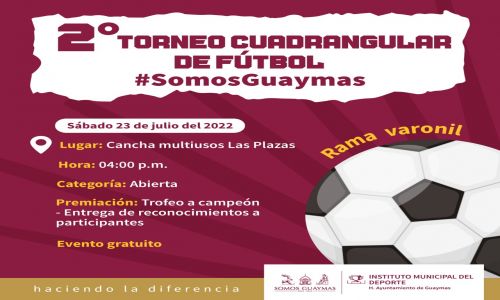 Guaymas, Sonora, 18 de julio de 2022.- Este 23 de julio, el Instituto Municipal del Deporte realizará el Segundo Torneo cuadrangular de Fútbol #SomosGuaymas, anunció Luis Ariel Iberri Sarabia.