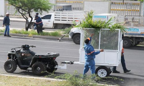 A partir de las 8:00 horas, 40 empleados iniciaron los trabajos en los camellones con el retiro de maleza acrecentada con las recientes lluvias, limpieza de laterales, barrido mecánico y manual, despapelado y poda de altura en palmeras para mejorar la imagen de una de las vialidades más transitadas de Hermosillo.