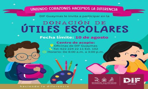 Guaymas, Sonora, 28 de julio de 2022. Con el objetivo de apoyar a familias de escasos recursos que cuenten con hijos en edad escolar, Sistema DIF Guaymas, invita a participar en la campaña de donación de útiles escolares.