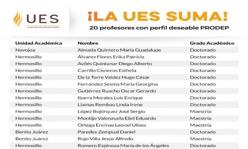Hermosillo, Sonora; 27 de agosto de 2022.- Con el reconocimiento de 20 maestros más con el Perfil Deseable otorgado por el Programa para el Desarrollo Profesional Docente (Prodep) de la Secretaría de Educación Pública (SEP), la Universidad Estatal de Sonora (UES) cuenta ya con un total de 85 profesores de tiempo completo con esta distinción nacional, destacó Armando Moreno Soto.