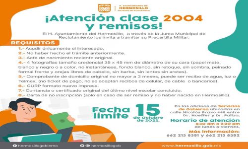 Hermosillo, Sonora, septiembre 28 de 2022.- El próximo viernes 15 de octubre cierra la convocatoria para realizar el trámite para obtener la precartilla militar en la Junta Municipal de Reclutamiento de Hermosillo, para los jóvenes clase 2004 y remisos.