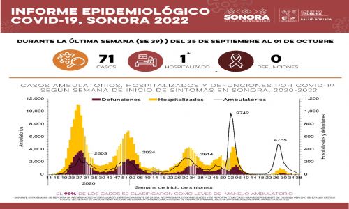 Hermosillo, Sonora; 4 de octubre de 2022.- La Secretaría de Salud (SSA) confirmó 71 nuevos casos de Covid-19 y ninguna defunción a causa de la enfermedad.