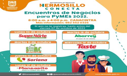 Estos encuentros de negocios inician el 10 de octubre y se realizarán hasta el 19 de octubre en las instalaciones de CANACINTRA, con la participación de Abarrey, Super del Norte, Soriana, Mandadito, Super MC, y Taste. Para el registro pueden comunicarse al teléfono 6625-520325.