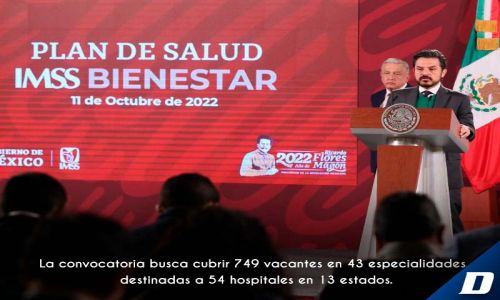 Durante la conferencia de prensa que encabezó el presidente Andrés Manuel López Obrador, el director general del IMSS, Zoé Robledo, indicó que la convocatoria para médicos especialistas busca cubrir 749 vacantes en 43 especialidades, destinadas a 54 hospitales en 13 estados, como parte del Plan de Salud IMSS-Bienestar.