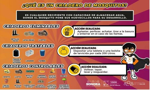 La SSA puntualizó que hay que identificar y eliminar los criaderos de mosquitos en llantas, botes vacíos, botellas y corcholatas; tratar posibles criaderos en tinacos, lavaderos y tambos; y controlar criaderos en juguetes, botellas rotas, bebederos para animales, cubetas, canaletas para el agua, entre otros.