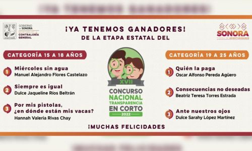 Hermosillo, Sonora; 22 de octubre 2022.- Como parte del seguimiento a la convocatoria de la décima séptima edición del Concurso Nacional de Transparencia en Corto, iniciativa en la que las juventudes expresaron sus ideas en un cortometraje de hasta 90 segundos, la Secretaría de la Contraloría General, a través de su jurado, definió a las y los ganadores en su etapa estatal.