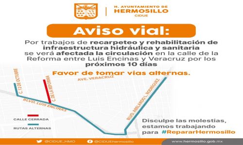 Se dispondrá de rutas alternas por las calles 12 de Octubre para incorporarse a la Veracruz y después a la Reforma; hacia el oriente se puede tomar el bulevar Luis Encinas y posteriormente el bulevar Rodríguez.