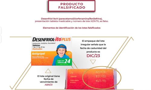 El otro medicamento falsificado es Desenfriol-ito Plus, con fórmula farmacéutica tableta masticable, con denominación X23V7X y fecha de vencimiento de diciembre de 2023.