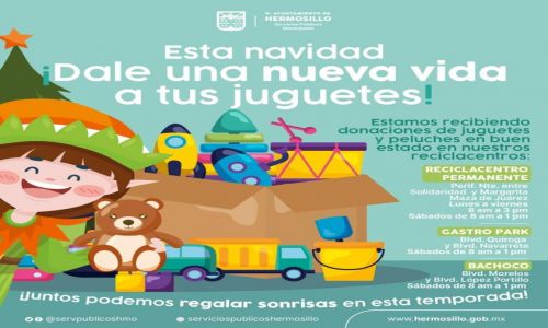 Hermosillo, Sonora; 8 de diciembre, 2022.- Durante la campaña “Esta Navidad dales una nueva vida a tus juguetes”, las ciudadanas y ciudadanos que regularmente llevan materiales reciclables de su basura doméstica a los Reciclacentros de Hermosillo, también podrán dejar estos artículos, ya sean nuevos o usados en buenas condiciones.
