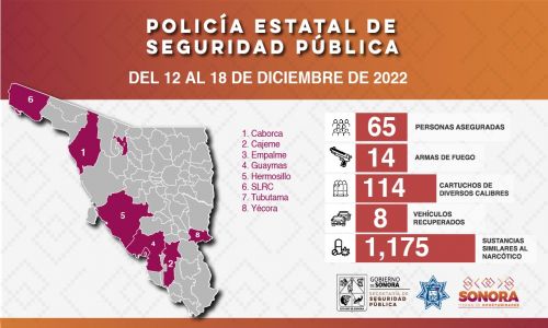 Hermosillo, Sonora; 20 de diciembre del 2022.- Las acciones operativas que mantiene la Policía Estatal de Seguridad Pública (PESP) en municipios de Sonora han dado como resultado el aseguramiento de 32 personas y el retiro de diversas sustancias prohibidas de las calles