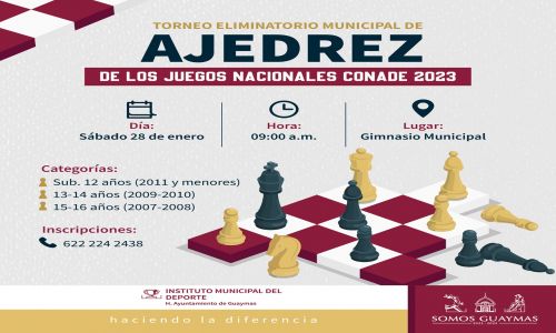 Guaymas, Sonora, 22 de enero de 2023.- Con el propósito de integrar el representativo para los Juegos Nacionales CONADE 2023, el Ayuntamiento de Guaymas en coordinación con el Instituto Municipal del Deporte, realizarán Torneo Eliminatorio de Ajedrez.