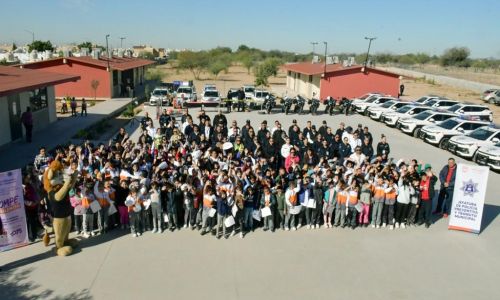 Hermosillo, Sonora; 11 de febrero, 2023.- Estudiantes de la Escuela Primaria Nueva Creación de Puerta Real disfrutaron de la convivencia con personal de la Policía Municipal y conocieron sobre su equipo y programas en la Feria de la Seguridad que se llevó a cabo en su plantel.