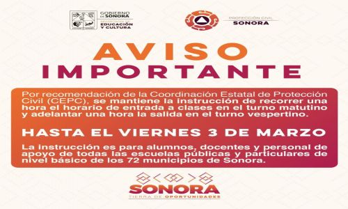 Hermosillo, Sonora; 19 de febrero de 2023.- Por recomendación de la Coordinación Estatal de Protección Civil (CEPC), se mantiene la instrucción de recorrer una hora el horario de entrada a clases en el turno matutino y adelantar una hora la salida en el turno vespertino hasta el viernes 3 de marzo, anunció el Gobierno de Sonora.