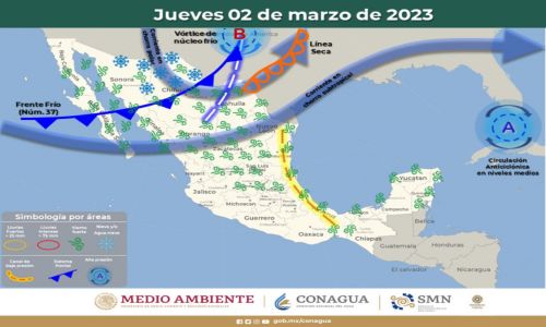 Hermosillo, Sonora; 28 de febrero de 2023.- Se espera que mañana miércoles por la tarde ingrese, por el noroeste de Sonora, el frente frío 37, asociado a un vórtice de núcleo frío y la corriente en chorro polar, con probabilidad de lluvias dispersas en los municipios del noroeste, norte, noreste y oriente, así como caída de aguanieve o nieve, en los municipios del norte, noreste y oriente.