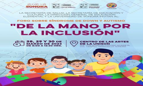 Hermosillo, Sonora; 29 de marzo de 2023.- Con el objetivo de informar a padres y madres de familia, así como a profesionales de la salud mental y estudiantes afines, la Secretaría de Salud (SSA) del Gobierno de Sonora inauguró el Foro sobre Síndrome de Down y Autismo, “De la Mano por la Inclusión”.