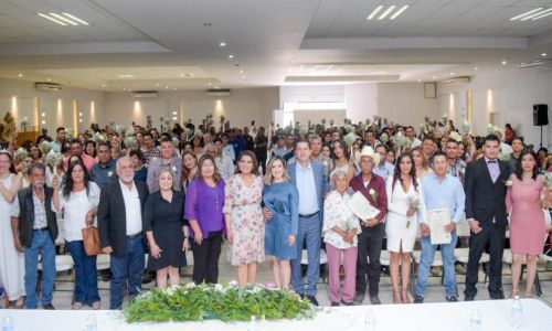 Navojoa, Sonora, 30 de marzo 2023.- El sí al enlace civil dieron este miércoles 105 parejas en la ceremonia pública de “Matrimonios colectivos 2023”, cuyas actas oficiales quedaron firmadas como testigos por el alcalde Jorge Alberto Elías Retes y su esposa Luz Argel Gaxiola de Elías, presidenta de DIF.