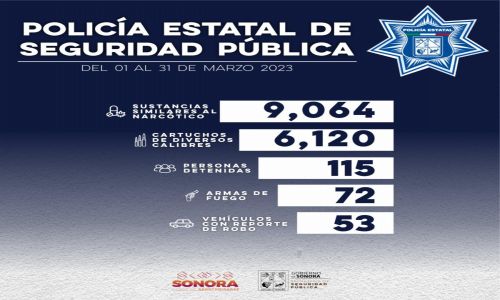 Hermosillo, Sonora; 3 de abril de 2023.- En acciones de prevención y combate al delito, la Policía Estatal de Seguridad Pública (PESP) generó aseguramientos de armas, vehículos y narcótico en trabajos coordinados con los tres niveles de gobierno en municipios de Sonora.