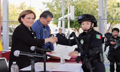María Dolores Del Río Sánchez, secretaria de Seguridad Pública, presidió la entrega de reconocimientos para los 25 oficiales de la PESP; entre estos, tres destacaron por Primer Puesto Académico, Mejor Tirador y Excelencia Física.