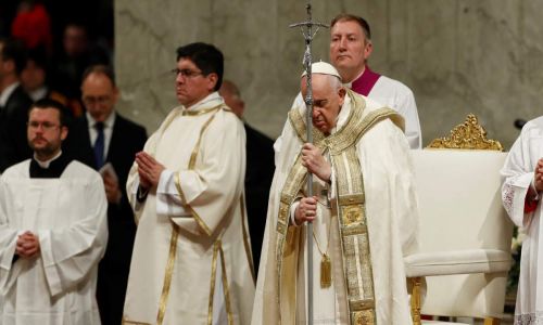 Al inicio de la Vigilia Pascual, Francisco -que llegó en silla de ruedas debido a una dolencia en la rodilla- grabó una cruz en la cera de un cirio, así como la primera y última letra del alfabeto griego (alfa y omega) y el año. Un clérigo llevó el cirio encendido por el pasillo central de la Basílica, entre los bancos a oscuras ocupados por los fieles. Decenas de cardenales y otros prelados lo siguieron portando velas.