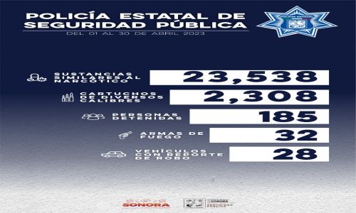 Hermosillo, Sonora; 3 de mayo de 2023.- En patrullajes de vigilancia y acciones de combate al delito, la Policía Estatal de Seguridad Pública (PESP) generó resultados durante el mes de abril en el aseguramiento de personas por flagrancia delictiva y sustancias prohibidas.