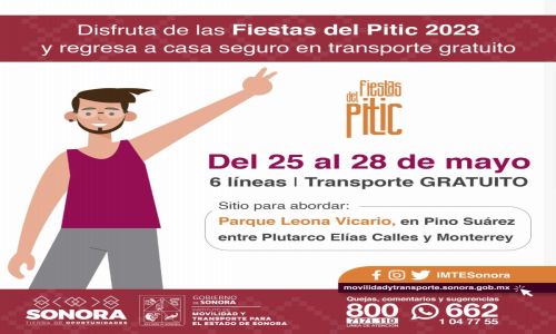 Hermosillo, Sonora; 24 de mayo de 2023.- El Gobierno de Sonora activará seis líneas de transporte para brindar servicio gratuito de movilidad al término de las actividades nocturnas de las Fiestas del Pitic 2023, con traslados seguros en camiones hacia las colonias.