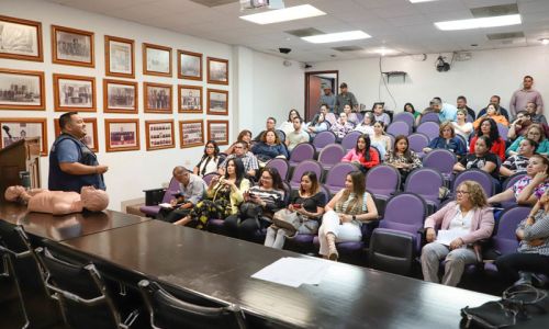 Hermosillo, Sonora, 28 de junio de 2023.- Personal administrativo del Congreso del Estado y del Centro de Investigaciones Parlamentarias recibieron esta mañana un curso de primeros auxilios, que fue impartido por el bombero de línea, Hermes Espinoza, quien expuso las diferentes técnicas que existen para el soporte básico de vida con base a atención de la víctima lesionada que así lo requiera en tanto recibe ayuda profesional.