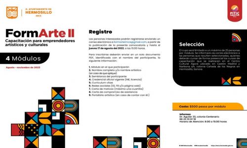 Hermosillo, Sonora; 15 de agosto, 2023.- La convocatoria para inscribirse en las capacitaciones de la segunda edición del programa FormArte del Instituto Municipal de Cultura y Arte (IMCA), dirigida a quienes conforman el gremio artístico y cultural de la ciudad, cerrará este jueves 17.