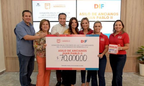 Hermosillo, Sonora; 25 de noviembre, 2023.- El Presidente Municipal, Antonio Astiazarán Gutiérrez, y su esposa Patricia Ruibal Zaragoza, presidenta de DIF Hermosillo, a nombre empleados del Ayuntamiento de Hermosillo, entregaron un donativo al Asilo de Ancianos “Juan Pablo II”, en apoyo a su colecta 2023, que concluye este mes de noviembre.