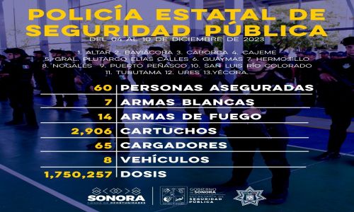 Hermosillo, Sonora; 11 de diciembre del 2023.- Operativos que ha realizado la Policía Estatal de Seguridad Pública (PESP) en municipios de Sonora, han generado el aseguramiento de 60 personas, además durante la coordinación con los tres niveles de gobierno incautaron lo equivalente a un millón 750 mil 257 dosis de sustancias similares al narcótico.