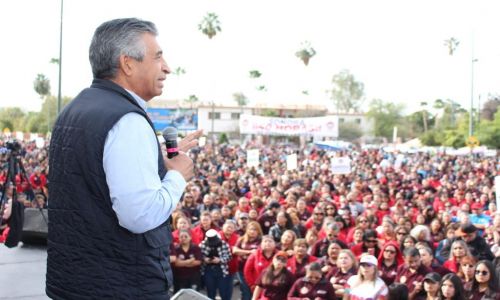 Por los trabajadores y sus familias fue la exigencia de la marcha que en la capital fue encabezada por el dirigente estatal de la Federación de Trabajadores del Estado, CTM Sonora, Javier Villarreal Gámez, y por el dirigente municipal Oscar Ortiz Arvayo, además de los secretarios generales de sus sindicatos.