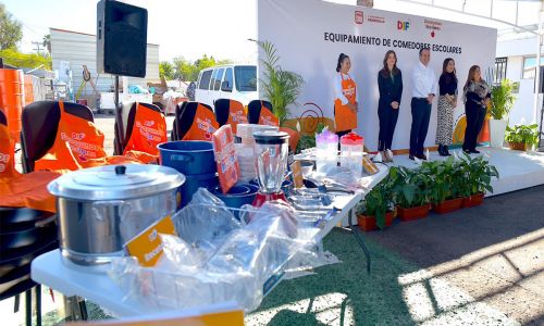 El equipo que cada escuela recibió consta de un refrigerador doméstico de 2 puertas, de 14 pies; una parrilla eléctrica de acero inoxidable empotrable, con encendido automático; una tarja de 2 tinas de acero inoxidable, que incluye llave mezcladora metálica; una alacena metálica con 2 puertas; una mesa plegable de plástico; una licuadora; una batería de peltre, con 8 piezas; entre otros utensilios.