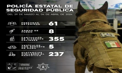 Hermosillo, Sonora; 7 abril de 2024.- En operativos de la última semana, oficiales de la Policía Estatal de Seguridad Pública (PESP), realizaron el aseguramiento de 61 personas por flagrancia delictiva e incautaron sustancias que ponían en riesgo la seguridad ciudadana, así como armas y narcótico.