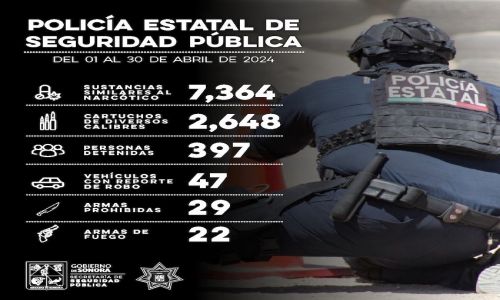 Hermosillo, Sonora; 03 de mayo del 2024.- Elementos de la Policía Estatal de Seguridad Pública (PESP), llevaron a cabo la detención de 397 personas y el aseguramiento de un arsenal y sustancias prohibidas que ponían en riesgo a la ciudadanía, durante operativos de prevención y combate al delito en municipios de Sonora.