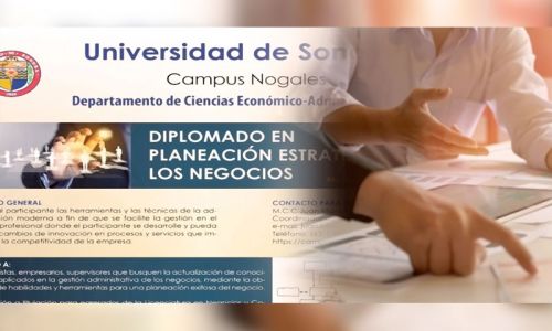 El Departamento de Ciencias Económico Administrativas de la Universidad de Sonora, campus Nogales, abre las inscripciones del 3 al 28 de junio para el Diplomado en Planeación Estratégica en los Negocios, que se ofrecerá del 12 de agosto al 2 de noviembre en modalidad virtual.
