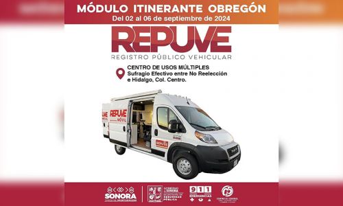 Cajeme, Sonora, 3 de septiembre de 2024.- En atención a la ciudadanía interesada en regularizar sus vehículos usados de procedencia extranjera, el Registro Público Vehicular (Repuve) perteneciente a la Secretaría de Seguridad Pública (SSP), instalará el módulo móvil en Cajeme del 2 al 6 de septiembre.