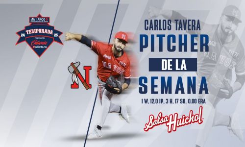 (Comunicación Liga ARCO).- El derecho norteamericano de los Mayos de Navojoa, Carlos Tavera, se llevó el nombramiento al Pitcher de la Semana presentado por Salsa Huichol luego de lo hecho en la semana cuatro de acción de la Liga ARCO Mexicana del Pacífico.