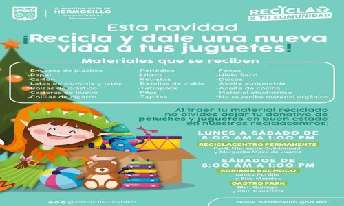 Hermosillo Sonora 2 de diciembre, 2024.- Con el objetivo de hacer de la próxima Navidad un momento especial para niñas y niños de familias vulnerables, el director de Servicios Públicos Municipales, Sergio Pavlovich Escalante, exhortó a las y los hermosillenses a donar peluches y juguetes en los reciclacentros.