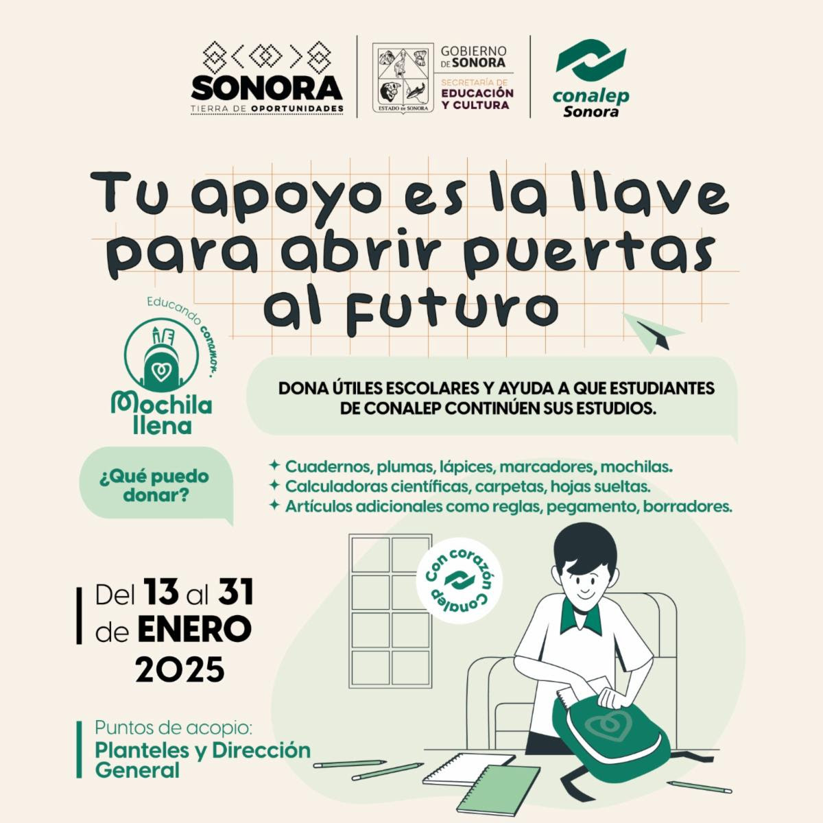 Hermosillo, Sonora; 15 de enero de 2025.- Con la finalidad de fomentar el altruismo y la solidaridad en beneficio del alumnado del Colegio de Educación Profesional Técnica del Estado de Sonora (Conalep), el subsistema invita a participar en el programa “Mochila Llena: Educando CONAmor”, informó Luisa Cristina Rodríguez Ibarra.