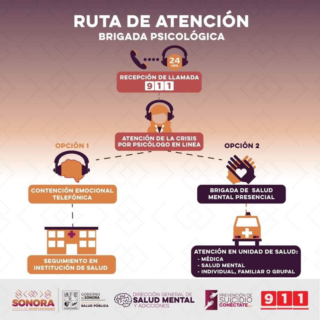 Cabe destacar que es la Dirección General de Salud Mental y Adicciones (DGSMA) quienes cuentan con este servicio gratuito para toda la comunidad en Sonora, donde además de la atención telefónica que se brinda en el 9-1-1, se da un seguimiento presencial de así requerirse, esto junto a elementos de Cruz Roja, Bomberos y Policía Municipal.
