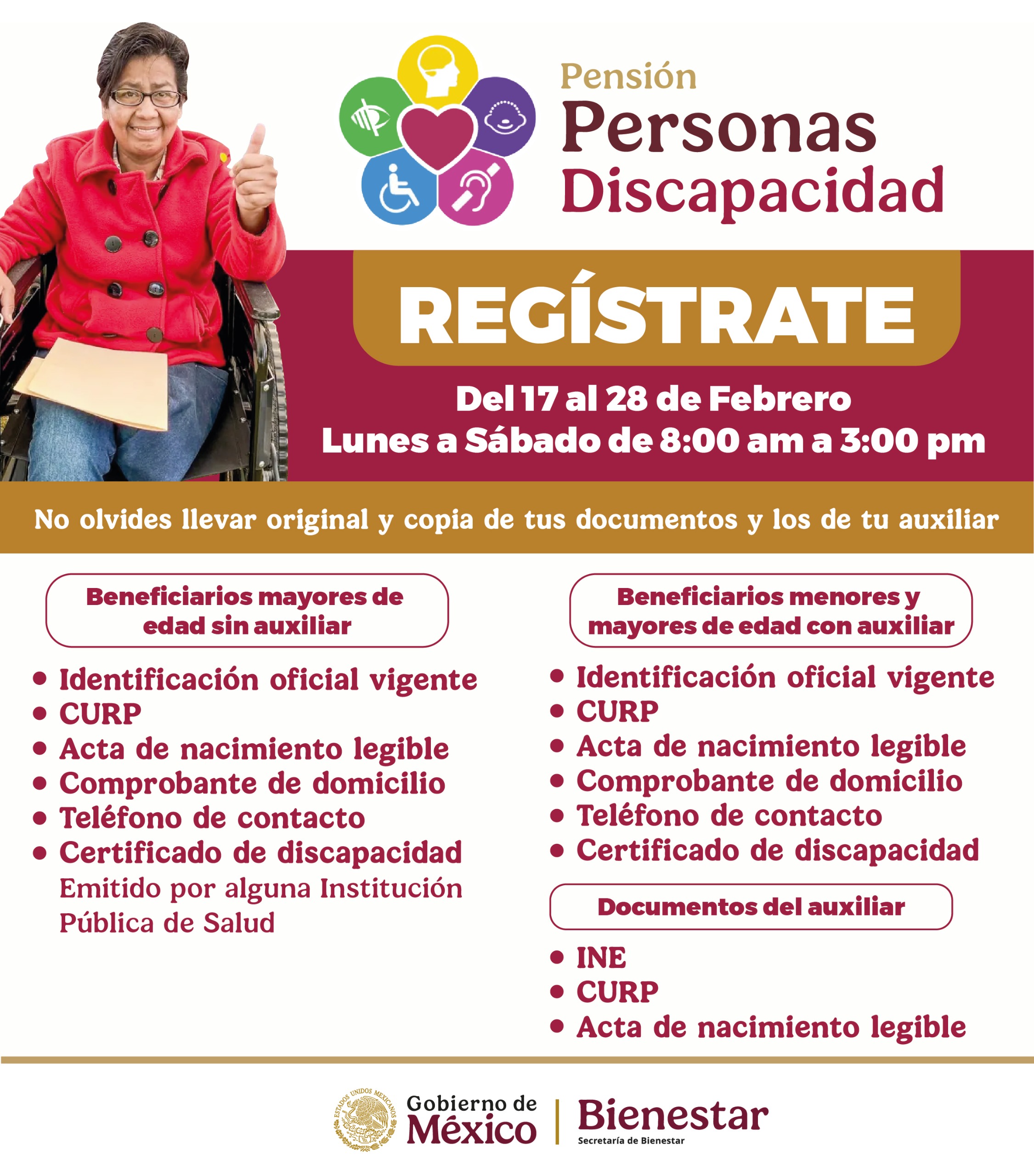 La secretaria de Bienestar, Ariadna Montiel Reyes, informó que, del 17 al 28 de febrero, las personas con discapacidad de 0 a 64 años son bienvenidas al registro para la Pensión para el Bienestar de las Personas con Discapacidad; mientras que en los estados de Aguascalientes, Coahuila, Durango, Guanajuato, Jalisco, Nuevo León y Querétaro, la inscripción es para personas de 0 a 29 años.