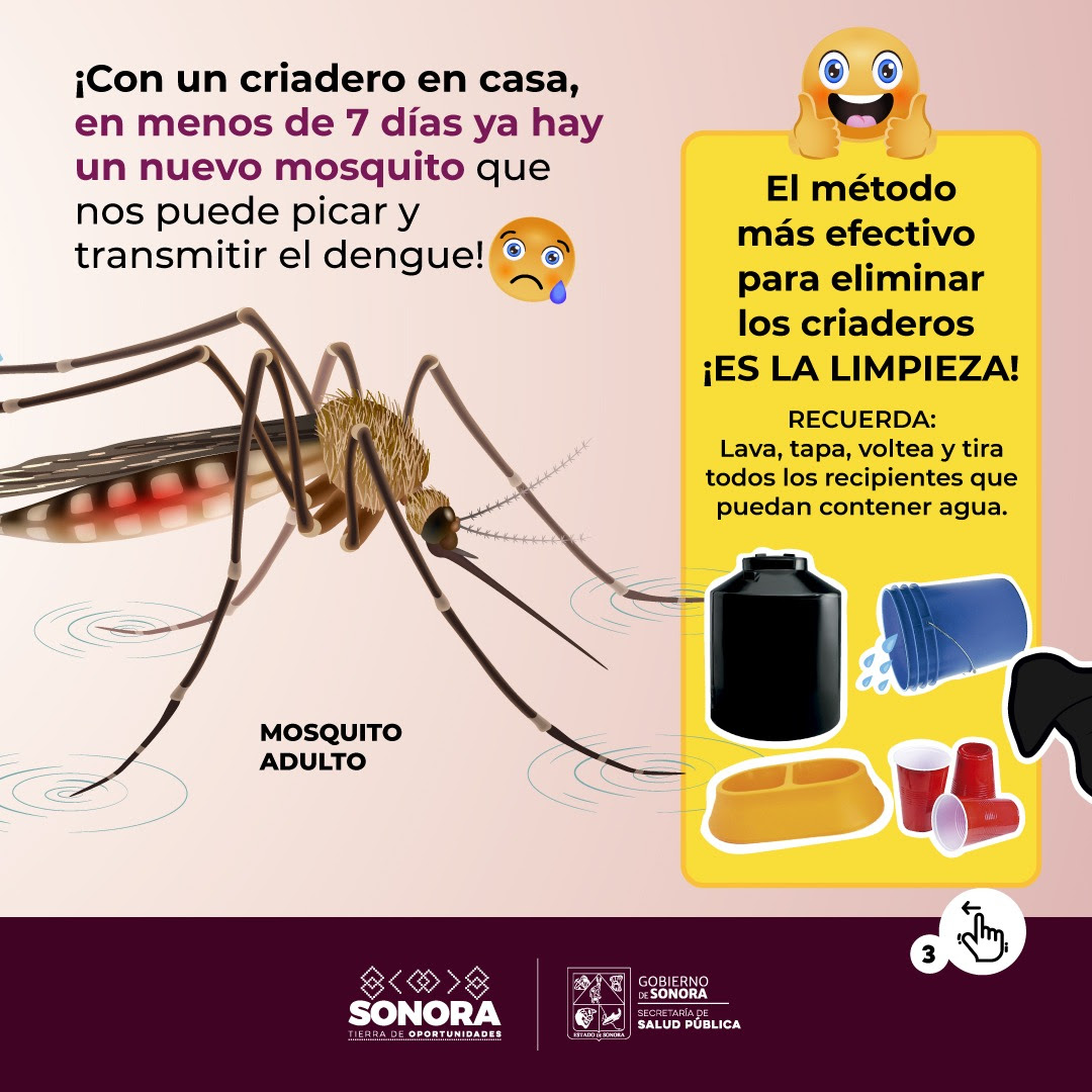 Hermosillo, Sonora; 21 de febrero de 2025.-La Secretaría de Salud Pública (SSP), informó que hasta la semana epidemiológica (SE) 07 del año se acumulan 8 casos y cero defunciones por dengue. Los casos corresponden a los municipios de Cajeme (tres), Guaymas (dos), Bácum, Álamos y Hermosillo (uno cada uno).