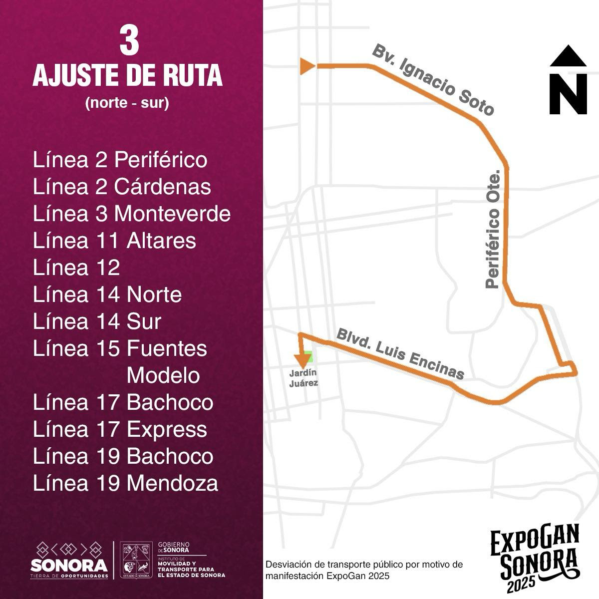 Hermosillo, Sonora; 25 de abril de 2025.- El Gobierno de Sonora, a través del Instituto de Movilidad y Transporte para el Estado de Sonora (IMTES), anuncia ajustes en las líneas de transporte urbano de Hermosillo debido a la manifestación de la ExpoGan 2025, programada para el próximo domingo 27 de abril.