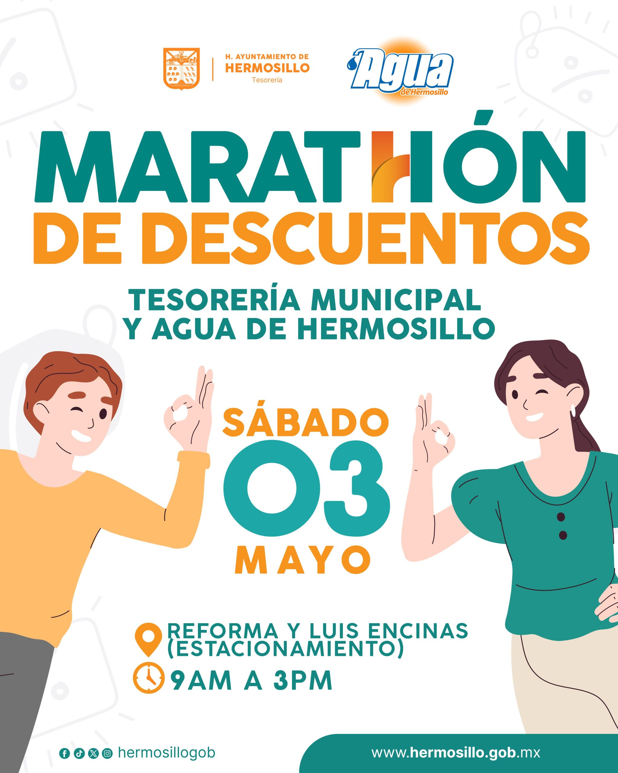 Hermosillo, Sonora; 01 de mayo, 2025.- Contribuyentes de Tesorería Municipal y Agua de Hermosillo que deseen ponerse al corriente tendrán una serie de descuentos en recargos de predial, multas de tránsito, además en adeudos de consumo del vital líquido en el Maratón de Descuentos de este sábado 3 de mayo.