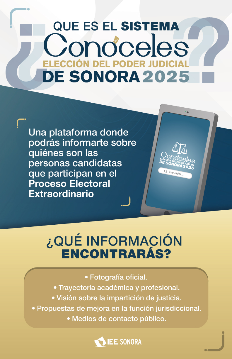 Este martes inició operaciones el sistema “Conóceles” para la elección de integrantes del Poder Judicial, habilitado por el Instituto Estatal Electoral y de Participación Ciudadana (IEE Sonora), con el objetivo de acercar la información de las personas candidatas que participan en esta jornada extraordinaria.