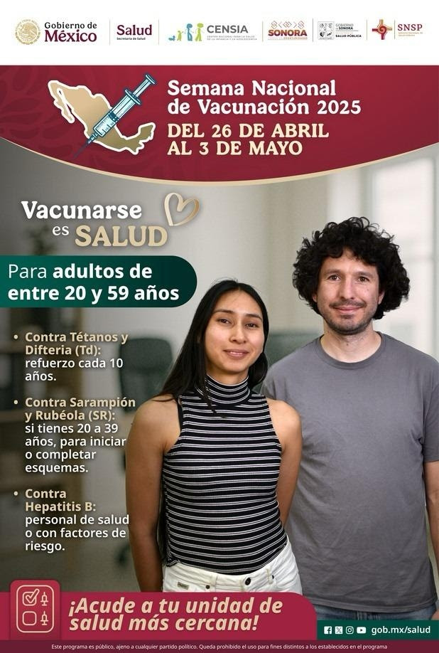 Hermosillo, Sonora; 3 de mayo de 2025.- La Secretaría de Salud (SSP) recordó que este sábado 3 de mayo concluye la Primera Semana Nacional de Vacunación, por lo que hizo un llamado a la población a acudir a los módulos fijos y semifijos, así como a las unidades médicas y hospitales de cualquier institución pública de salud, para aplicarse las vacunas correspondientes o completar su esquema de inmunización.