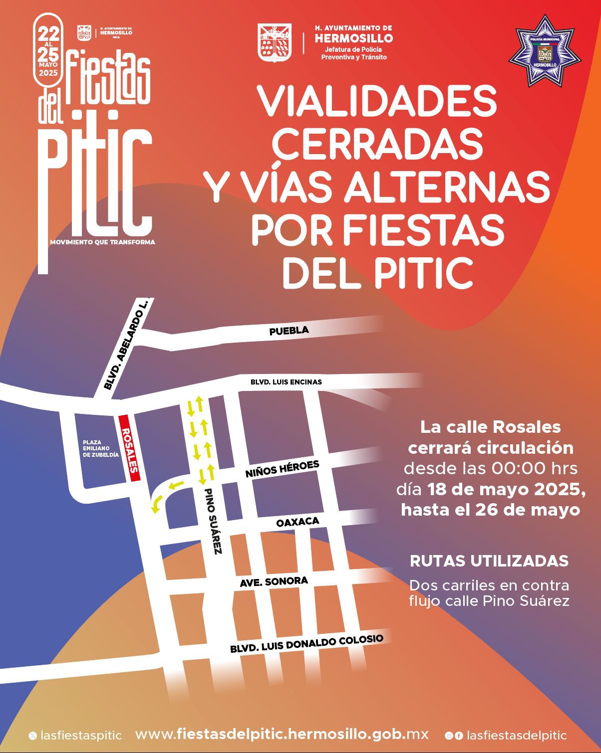 Hermosillo, Sonora a 16 de mayo, 2025.- Durante las primeras horas de este domingo 18 mayo se cerrará al tráfico vehicular en la avenida Rosales, ante la instalación del escenario de las Fiestas del Pitic 2025.