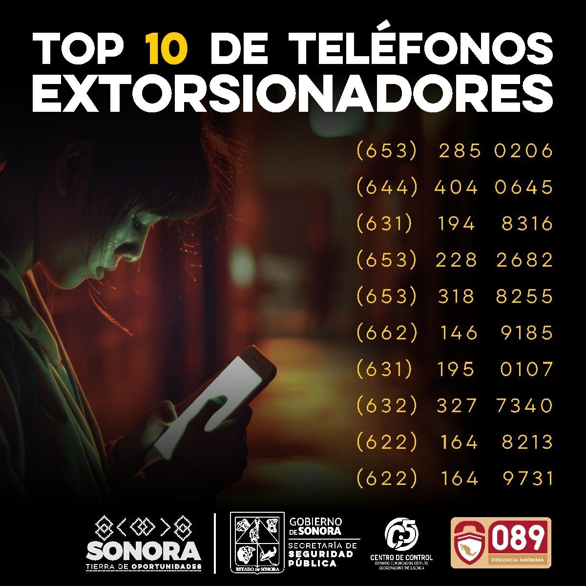 Hermosillo, Sonora; 19 de mayo de 2025.- Gracias a la colaboración de la ciudadanía que denuncia en la línea anónima 089, el Gobierno de Sonora, a través de la Secretaría de Seguridad Pública (SSP), compartió un listado con los diez números telefónicos más reportados por intentos de extorsión, con el objetivo de prevenir este delito y proteger a la población.