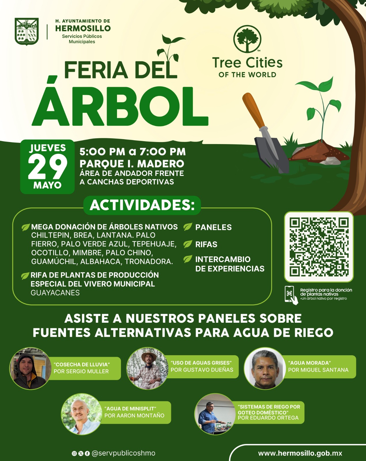 Hermosillo, Sonora; 28 de mayo, 2025.- Una invitación a sumarse a la Feria del Árbol extendió el Ayuntamiento de Hermosillo este jueves 29 de mayo de 5:00 a 7:00 de la tarde en el Parque Madero donde se llevará a cabo una celebración especial con donaciones de especies nativas y charlas enriquecedoras sobre el cuidado del entorno.