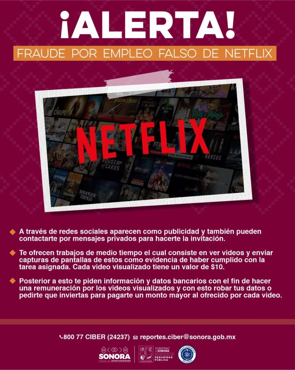 Hermosillo, Sonora; 17 de julio de 2025.- En labores de ciberpatrullaje en redes sociales, el Gobierno de Sonora identificó una nueva modalidad de fraude que oferta empleos falsos en nombre de la empresa Netflix, por lo que comparte recomendaciones para evitar ser víctima de este tipo de delitos.
